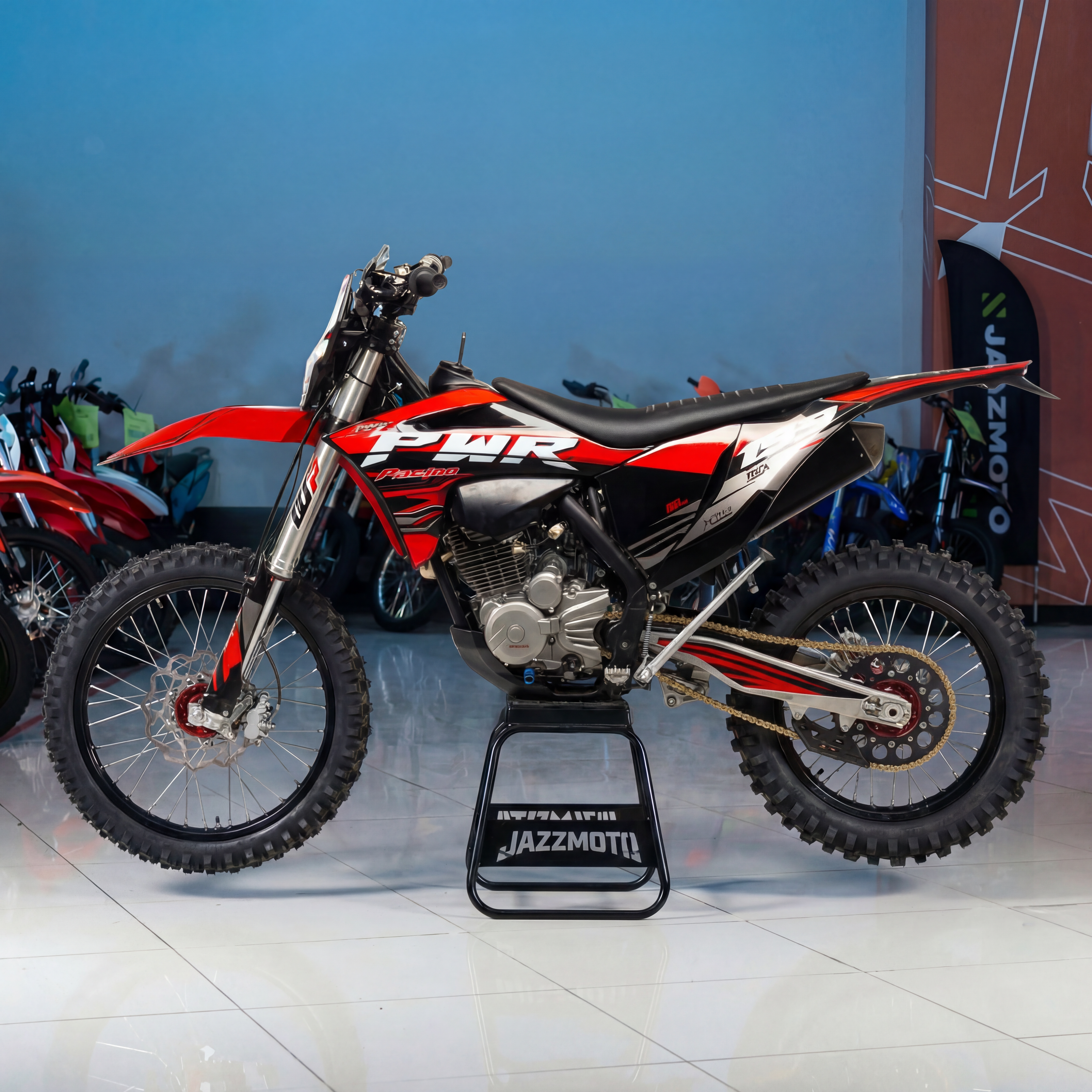 PWR MC250 — мотоцикл кроссовый PWR MC250 (172FMM-3A) с современным дизайном, который подчеркивает спортивный характер байка. Модель больше предназначена для езды по пересеченной местности, полям и лесам, чем для города, и хорошо показывает себя там, где важны маневренность, удобство и уверенный контроль. Этот мотоцикл прост в управлении, неприхотлив в обслуживании и подходит мотолюбителям любого возраста и опыта вождения. Дополнительный комфорт в эксплуатации обеспечивают высокий вынос руля и сидение с противоскользящим чехлом.